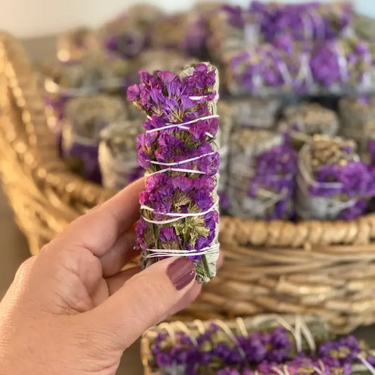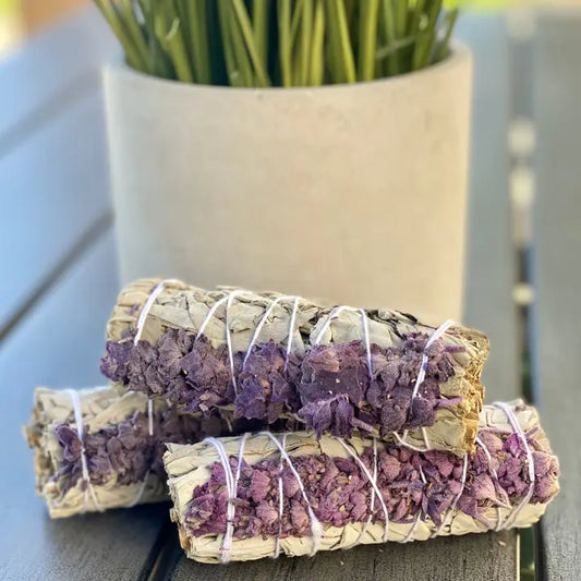 WHITE SAGE SMUDGE STICKS WITH PURPLE FLOWERS