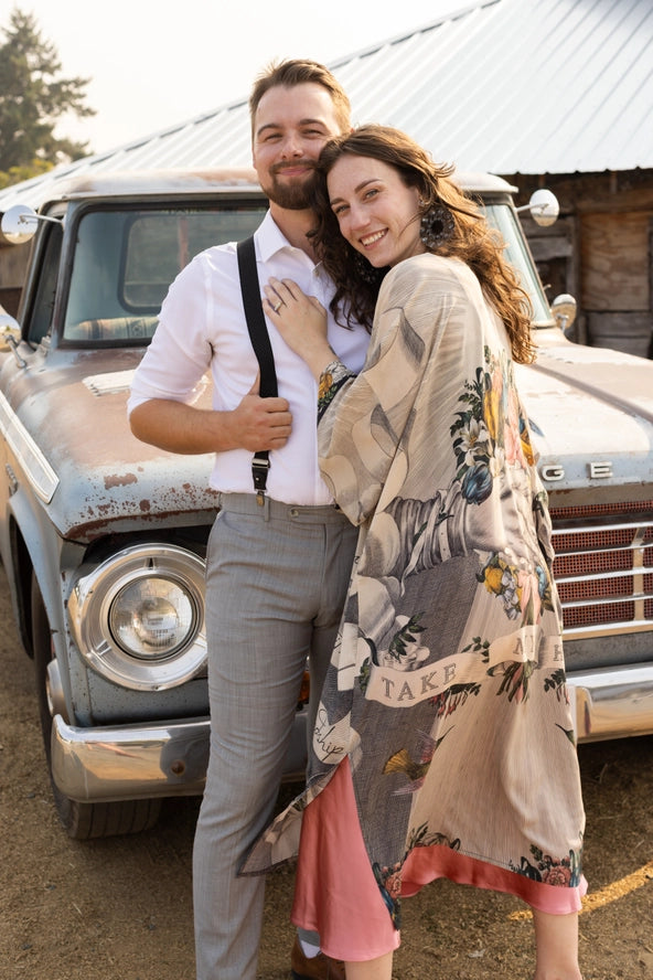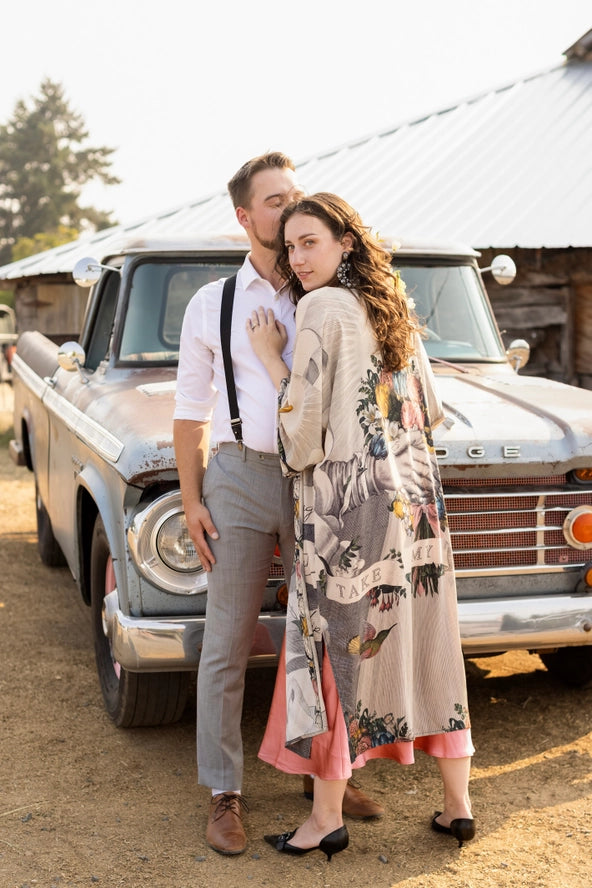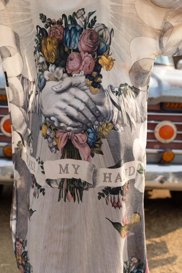 A full-length opera duster crafted from 100% viscose, featuring a Victorian-inspired collage of historical artwork. The design showcases clasped hands, botanical elements, and a bilingual message celebrating friendship. Includes a removeable belt and hand-colored floral trim. Length 118cm, width 78cm. Ideal for bohemian and artistic occasions.